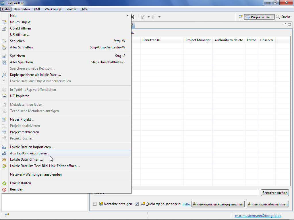 To start the Export Tool, choose "File > Export from TextGrid ..." in the menu bar. A perspective must be open to use the Export Tool.