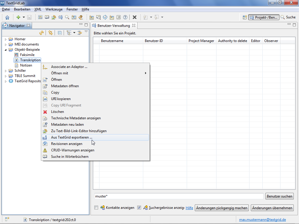 Alternatively you can choose"Export from TextGrid ..." in the context menu by right-clicking an Object in the Navigator or the Search Results View.