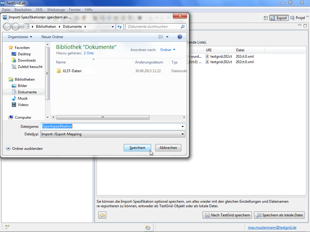 After the Export procedure is completed you can choose to save the Export specifications optionally as TextGrid Object or as local file, to be able to import or export data with the same configuration and file names again. Saving these specifications is not necessary to save the data to export completely and correctly though.